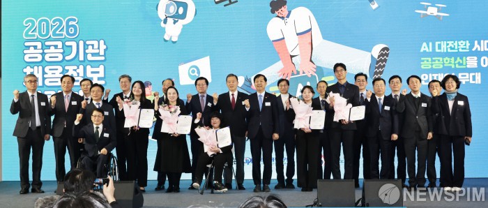 [서울=뉴스핌] 양윤모 기자 = 구윤철 경제부총리가 27일 오후 서울 양재동 aT센터에서 개막된 '2026 공공기관 채용정보박람회'에 참석해 기념촬영을 하고 있다. 29일까지 개최되는 이번 박람회는 140여개 기관이 참여하고, 4만여명의 취업준비생이 방문하는 국내 최대 규모의 채용 행사이다. 2026.01.27 yym58@newspim.com