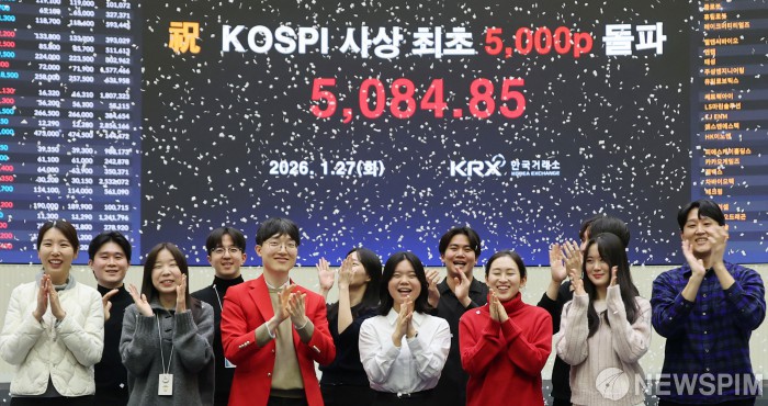 [서울=뉴스핌] 이형석 기자 = 코스피 지수가 종가 기준 5000을 돌파한 27일 오후 서울 여의도 한국거래소에서 직원들이 박수를 치며 환호하고 있다. 2026.01.27 leehs@newspim.com