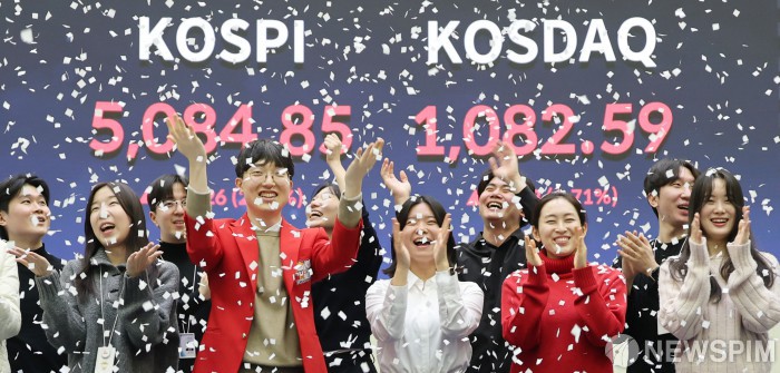 [서울=뉴스핌] 이형석 기자 = 코스피 지수가 종가 기준 5000을 돌파한 27일 오후 서울 여의도 한국거래소에서 직원들이 박수를 치며 환호하고 있다. 2026.01.27 leehs@newspim.com