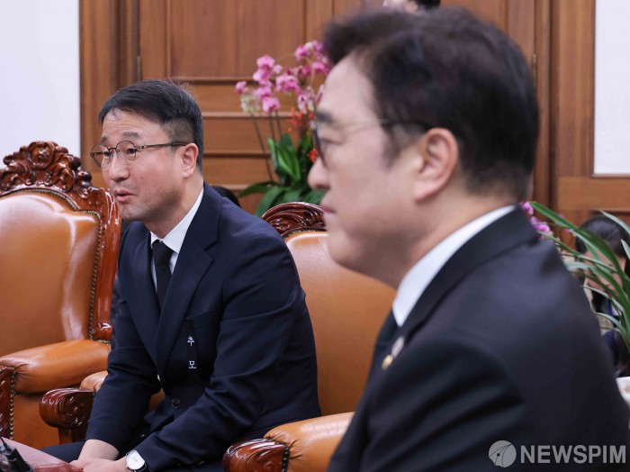 [서울=뉴스핌] 윤창빈 기자 = 한병도 더불어민주당 원내대표가 27일 서울 여의도 국회에서 우원식 국회의장 주재로 열린 여야 원내대표 회동에서 모두발언을 하고 있다. 2026.01.27 pangbin@newspim.com