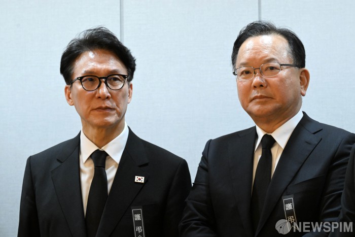 [서울=뉴스핌] 사진공동취재단 = 김민석 국무총리(왼쪽)와 김부겸 전 총리(오른쪽)가 27일 서울 종로구 서울대학교병원 장례식장에 마련된 이해찬 민주평화통일자문회의 수석부의장의 빈소에서 조문객을 맞이하고 있다. 2026.01.27 photo@newspim.com