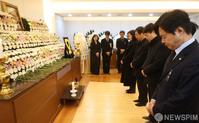 [서울=뉴스핌] 사진공동취재단 = 김현정 더불어민주당 의원(오른쪽 첫번째)이 27일 오후 서울 종로구 서울대학교병원 장례식장에 마련된 고(故) 이해찬 민주평화통일자문회의 수석부의장의 빈소를 찾아 조문하고 있다. 2026.01.27 photo@newspim.com