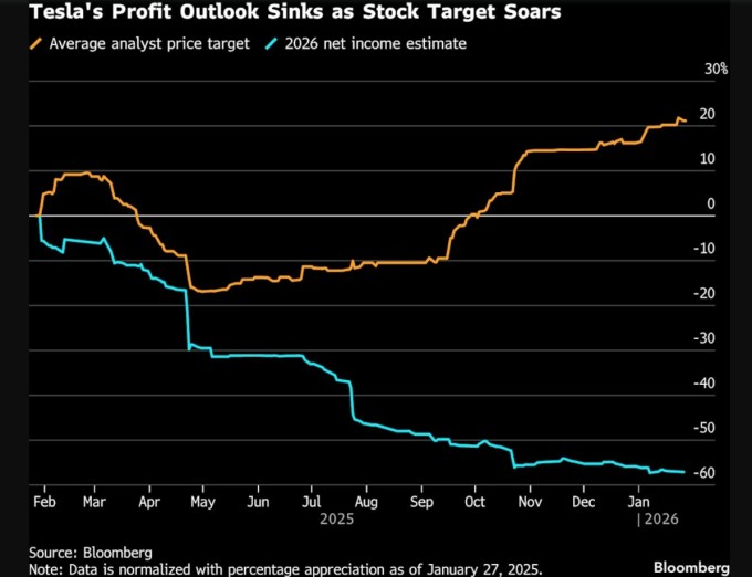 니콜라스 콜라스는 "이 같은 흐름은 매우 이례적"이라며, 일반적으로 목표주가 상향은 실적 전망 개선과 맞물려 나타나지만 테슬라의 경우는 기대치가 낮아지는 상황에서 목표가가 오르고 있다고 지적했다. 테슬라는 28일 4분기 및 연간 실적을 발표할 예정이다. 회사 측은 논평 요청에 응하지 않았다.