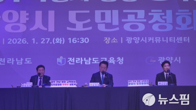 전라남도는 지난 27일 광양시 커뮤니티센터와 여수시민회관에서 '광주·전남 행정교육통합 도민공청회'를 연이어 개최했다고 28일 밝혔다. 이날 광양 공청회에는 김영록 전남지사, 김태균 도의장, 김대중 교육감, 정인화 광양시장 등 주요 인사와 시민·산업 관계자 500여 명이 참석해 열띤 토론을 벌였다.