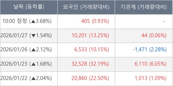 [서울=뉴스핌] 로보뉴스 = 28일 10시 15분 현재 코스텍시스(355150)는 전일 대비 3.68% (현재가 13,250원) 상승했고, 외국인이 최근 5일 연속 순매수(누적 70,527주, 잠정) 행진을 하고 있다.