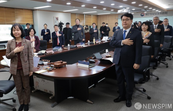 [서울=뉴스핌] 이길동 기자 =송경희 개인정보보호위원회 위원장이 28일 정부서울청사에서 열린 개인정보보호위원회 전체회의에서 참석자들과 국기에 경례하고 있다. 2026.01.28 gdlee@newspim.com