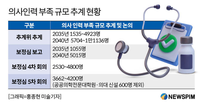 보정심은 매주 회의를 통해 의사 부족 규모를 줄이고 있다. 당초 의사인력수급추계위(추계위)에서 발표한 의사 부족 수는 2035년 기준 1535~4923명, 2040년 기준 5704~1만1136명이다.