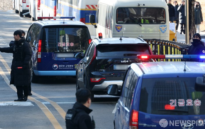 [서울=뉴스핌] 정일구 기자 = 김건희 여사의 자본시장법 위반·알선수재·정치자금법 위반 등 혐의 사건에 대한 1심 선고기일인 28일 오후 서울 서초구 서울중앙지방법원에서 김 여사가 탑승한 호송차량이 법원으로 들어서고 있다. 2026.01.28 mironj19@newspim.com