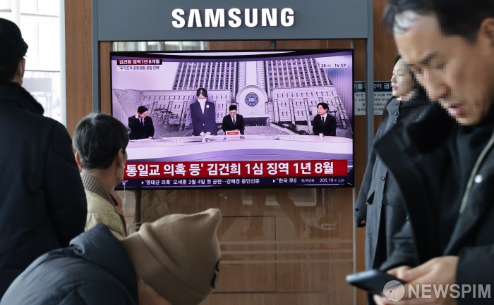 [서울=뉴스핌] 양윤모 기자 = 28일 오후 서울역 대합실을 찾은 시민들이 서울중앙지법 형사합의27부(부장판사 우인성)에서 진행되는 윤석열 전 대통령 부인 김건희 씨의 도이치모터스 주가조작과 명태균 공천개입, 통일교 청탁·뇌물 수수 의혹 혐의 등의 1심 선고 중계방송을 시청하고 있다. 재판부는 자본시장법 위반·알선수재·정치자금법 위반 등 혐의를 받는 김 씨에게 징역 1년 8개월과 추징금 1281만 원을 선고했다. 한편 재판부는 김 여사 혐의 중 도이치모터스 주가조작(자본시장법 위반), 명태균 여론조사(정치자금법 위반) 관련 혐의는 무죄로 판단했다. 2026.01.28 yym58@newspim.com