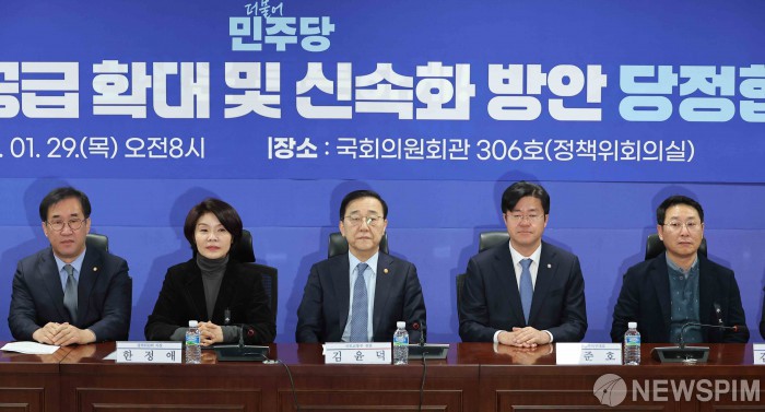 [서울=뉴스핌] 윤창빈 기자 = 한정애 더불어민주당 정책위의장, 김윤덕 국토교통부 장관 등 참석자들이 29일 서울 여의도 국회 의원회관에서 열린 도심 주택공급 확대 및 신속화 방안 관련 당정협의에서 기념촬영을 하고 있다. 2026.01.29 pangbin@newspim.com