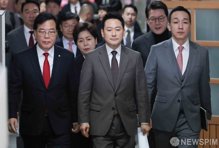 [서울=뉴스핌] 윤창빈 기자 = 장동혁 국민의힘 대표, 송언석 원내대표를 비롯한 당직자들이 29일 서울 여의도 국회에서 열린 최고위원회의에 참석하고 있다. 2026.01.29 pangbin@newspim.com