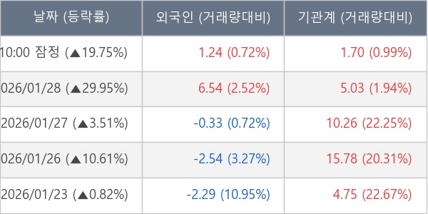 [서울=뉴스핌] 로보뉴스 = 29일 10시 15분 현재 에코프로에이치엔(383310)은 전일 대비 19.75% (현재가 43,650원) 상승했고, 기관이 최근 5일 연속 순매수(누적 37.52만 주, 잠정) 행진을 하고 있다.