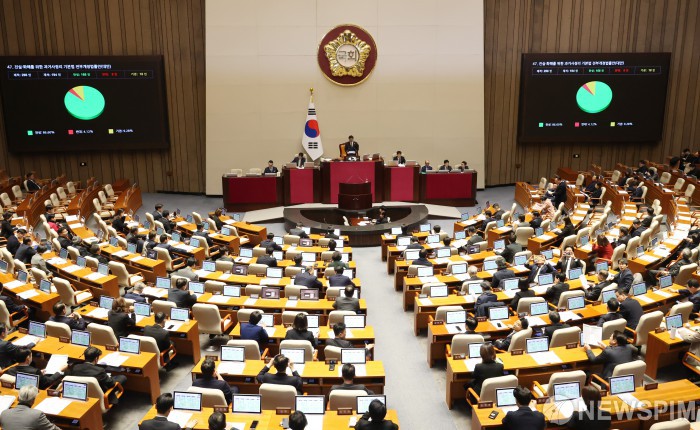 [서울=뉴스핌] 정일구 기자 = 29일 오후 서울 여의도 국회에서 열린 본회의에서 진실·화해를 위한 과거사정리 기본법 전부개정법률안(대안)이 가결되고 있다. 2026.01.29 mironj19@newspim.com