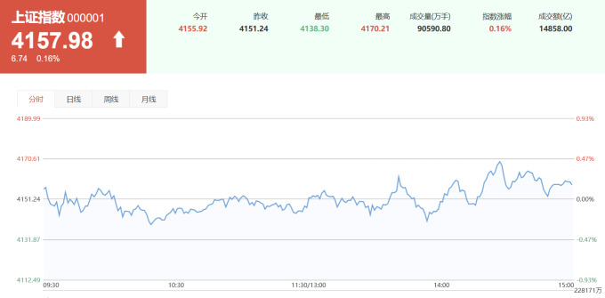 이날 상하이종합지수는 0.16% 상승한 4157.98, 선전성분지수는 0.30% 하락한 14300.08, 촹예반지수는 0.57% 하락한 3304.51로 각각 장을 마감했다.