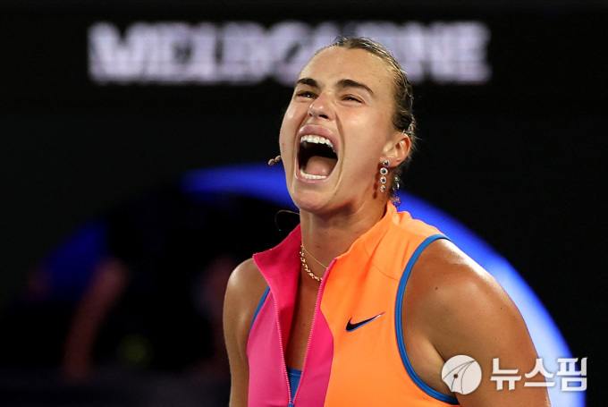 [멜버른 로이터=뉴스핌] 장환수 스포츠전문기자= 아리나 사발렌카가 29일 엘리나 스비톨리나와 호주오픈 여자 단식 4강전에서 포인트를 따낸 뒤 환호하고 있다. 2026.01.29 zangpabo@newspim.com
