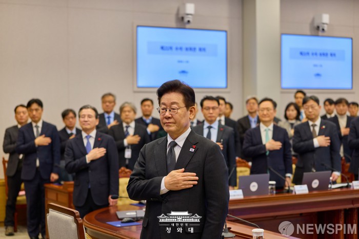 [서울=뉴스핌] 이재명 대통령이 지난 29일 서울 청와대에서 열린 수석·보좌관 회의에서 국기에 대한 경례를 하고 있다. [사진=청와대] 2026.01.30 photo@newspim.com