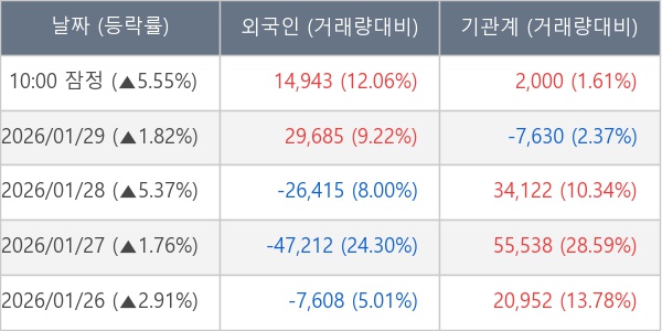 [서울=뉴스핌] 로보뉴스 = 30일 10시 15분 현재 이엔에프테크놀로지(102710)는 외국인과 기관이 각각 1.49 만 주, 0.20 만 주 순매수(잠정) 하면서 전일 대비 5.55% (현재가 59,000원) 상승하고 있다.