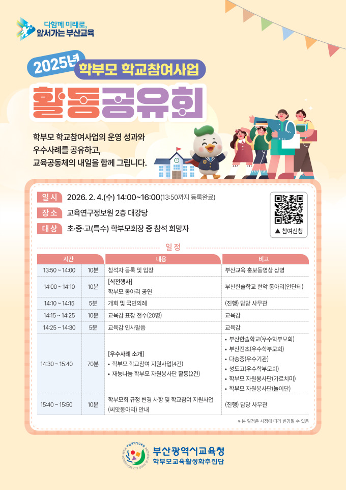 김석준 부산시교육감은 "학부모의 자발적이고 주도적인 참여는 교육공동체 협력의 핵심 동력"이라며 "이번 활동공유회를 통해 우수사례가 확산되고 학부모 학교참여 문화가 학교 현장에 뿌리내리길 바란다"고 말했다.