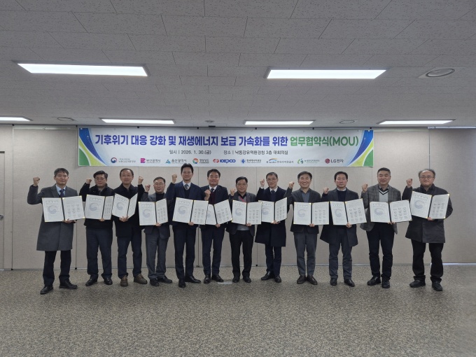 낙동강유역환경청이 30일 청사 3층 회의실에서 열린 부산시, 울산시, 경남도, 한국전력공사 남부건설본부, 한국에너지공단 부산울산지역본부·경남지역본부, 한국수자원공사 낙동강유역본부, 부·울·경 녹색지원센터, 녹색기업과 함께 업무협약(MOU)을 체결한 뒤 기념사진을 찍고 있다.[사진=낙동강유역환경청] 2026.01.30