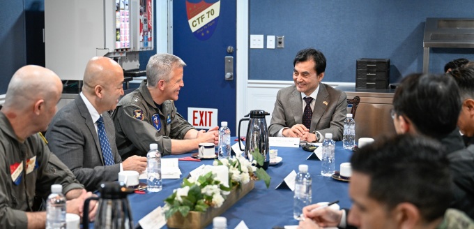 안규백 국방부장관이 30일 미 해군 항공모함 조지워싱턴함 사관실에서 패트릭 해니핀(Patrick Hannifin) 미 해군 제7함대사령관과 환담을 나누고 있다. 이날 안규백 장관은 굳건한 한미동맹과 연합작전태세의 중요성을 강조하고, 우리 해군과 미 7함대 간의 긴밀한 협조를 당부했다. [사진=국방부 제공] 2026.01.30 gomsi@newspim.com