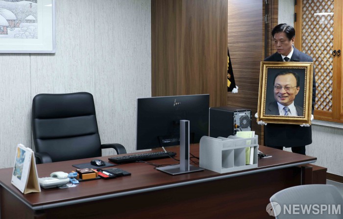 [서울=뉴스핌] 윤창빈 기자 = 31일 오전 고(故) 이해찬 전 국무총리의 영정이 서울 여의도 더불어민주당 중앙당사 당대표 집무실로 들어서고 있다. 2026.01.31 pangbin@newspim.com