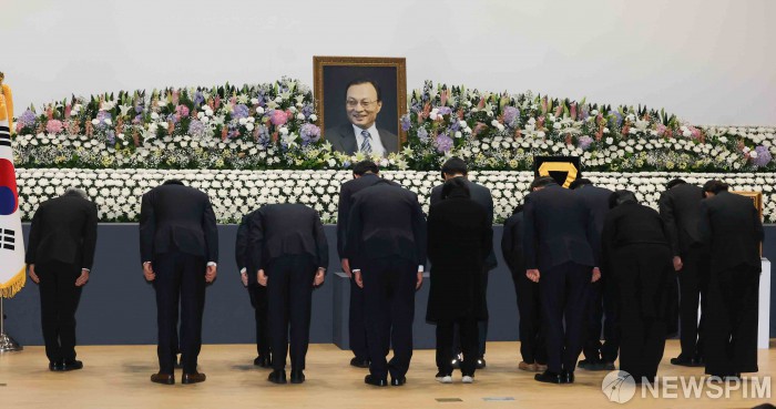 [서울=뉴스핌] 윤창빈 기자 = 31일 오전 서울 여의도 국회 의원회관에서 열린 고(故) 이해찬 전 국무총리 영결식에서 참석자들이 묵념을 하고 있다. 2026.01.31 pangbin@newspim.com
