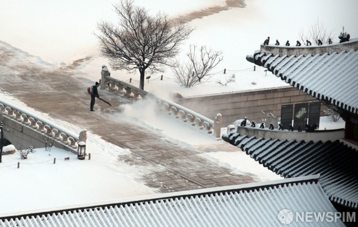 [서울=뉴스핌] 이길동 기자 = 2일 오전 서울 종로구 경복궁에서 관계자들이 밤사이 내린 눈을 치우고 있다.2026.02.02 gdlee@newspim.com