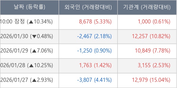 [서울=뉴스핌] 로보뉴스 = 02일 10시 15분 현재 알멕(354320)은 전일 대비 10.34% (현재가 68,300원) 상승했고, 기관이 최근 8일 연속 순매수(누적 53,066주, 잠정) 행진을 하고 있다.