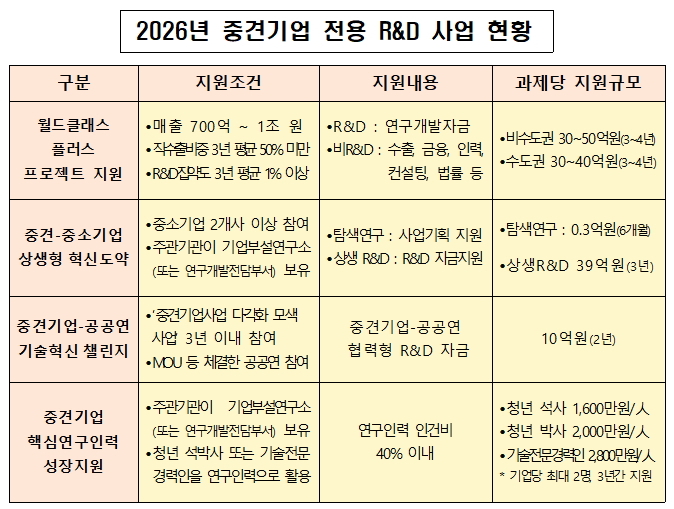 구체적으로 ▲월드클래스 플러스 프로젝트 지원(284억원) ▲중견-중소기업 상생형 혁신도약(252억원) ▲중견기업-공공연 기술혁신 챌린지(33억원) ▲중견기업 핵심연구인력 성장지원(13억원) 등이다(표 참고).