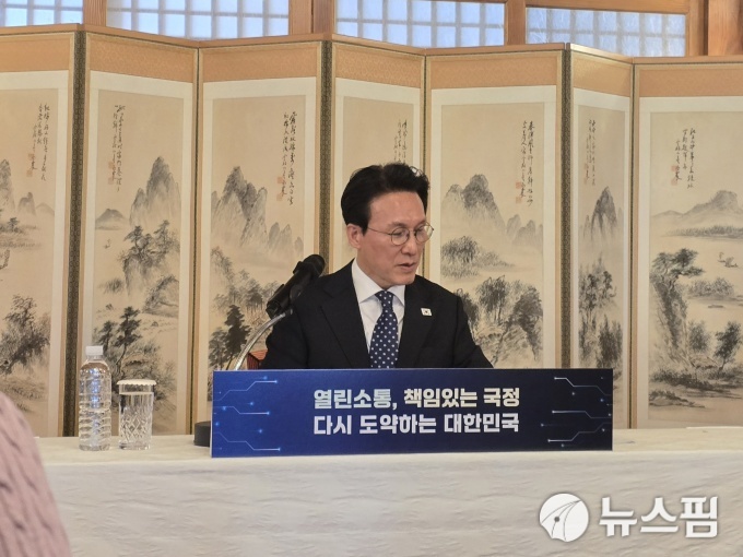 [서울=뉴스핌] 양가희 기자 = 김민석 국무총리가 2일 서울 삼청동 총리공관에서 기자간담회를 열고 모두발언을 말하고 있다. 2026.02.02 sheep@newspim.com