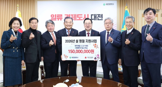 [대전=뉴스핌] 김수진 기자 = 대전시는 설 명절을 앞두고 대전사회복지공동모금회가 저소득 소외계층을 위한 성금 1억 5000만 원을 기탁했다고 2일 밝혔다. 기탁식에는 유재욱 대전사회복지공동모금회 회장이 참석해 이장우 대전시장에게 성금을 전달했다. 시는 이번에 전달받은 기탁금 중 1억 3500만 원을 저소득가정 3321가구에 현금으로 지원해 명절 준비 부담을 덜어줄 예정이다. 나머지 1500만 원은 쪽방상담소와 이주외국인종합복지관 등 복지시설의 설맞이 행사 지원금으로 사용한다는 계획이다. [사진=대전시] nn0416@newspim.com