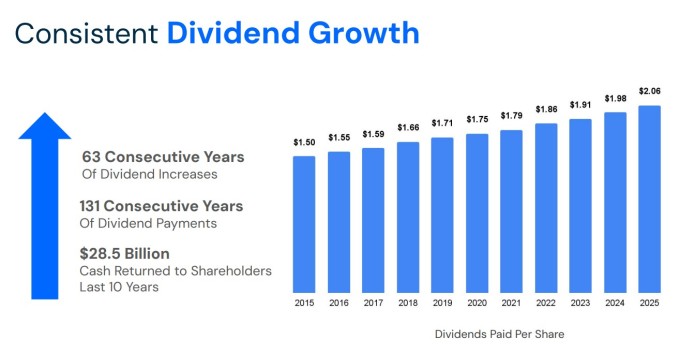 현재 배당수익률은 2.30%이며, 지난 10년간 배당은 연평균 4%씩 증가했다. 2026년 초에도 비슷한 수준의 인상으로 주당 연간 2.16달러에 이를 가능성이 높으며, 이는 배당수익률을 2.8%로 끌어올릴 전망이다.