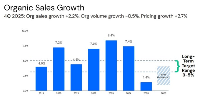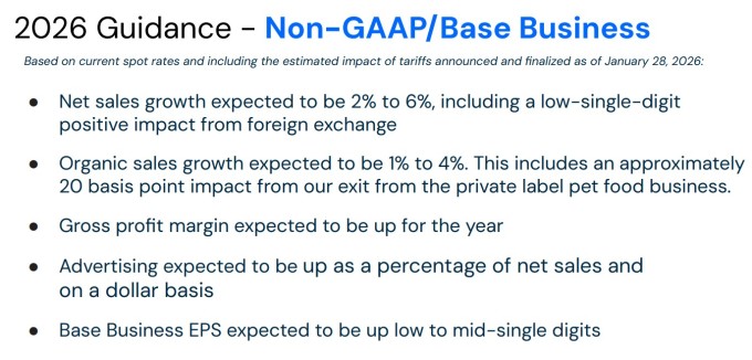 2026년 전망과 관련해 회사는 외환 효과를 포함한 순매출 2~6% 증가, 유기적 매출 1~4% 성장을 제시했다. 조정 주당순이익(EPS)은 낮은 한 자릿수에서 중간 한 자릿수 성장을 전망했다. 총이익률 확대와 광고 지출 증가도 계획에 포함됐다.