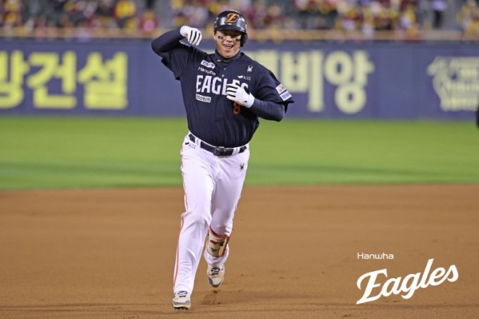 [멜버른=뉴스핌]이웅희 기자=한화 노시환이 LG와의 한국시리즈에서 홈런을 터트린 뒤 세리머니를 하고 있다. [사진=한화 이글스] 2026.02.03 iaspire@newspim.com
