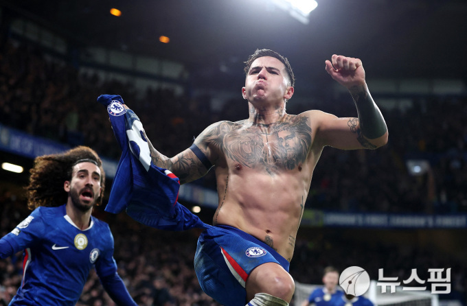 [런던 로이터=뉴스핌] 첼시의 엔조페르난데스가 1일에 열린 웨스트햄과의 경기에서 후반 추가시간 극장 역전골을 넣은 뒤 세리머니 하고 있다. 2026.02.01 wcn05002@newspim.com