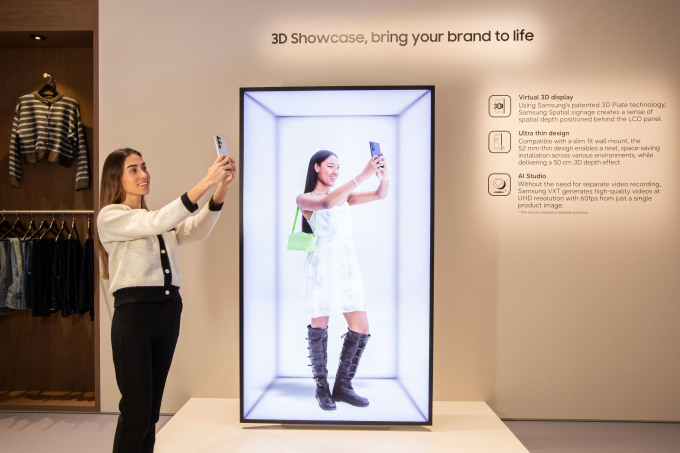 이번 전시회에서 삼성전자는 1728㎡ 규모의 대형 전시관을 마련하고 초슬림 두께로 3D 공간감을 극대화한 '스페이셜 사이니지' 85형 모델을 글로벌 시장에 출시했다. 이 제품은 삼성전자의 독자적인 '3D 플레이트' 기술을 적용해 52mm의 얇은 두께에도 화면 안쪽에 실제 공간이 있는 듯한 깊이감을 제공하며, 리테일 매장에서 제품을 360도로 회전시키는 실감 나는 영상을 2D 수준의 선명도로 구현할 수 있는 것이 특징이다.