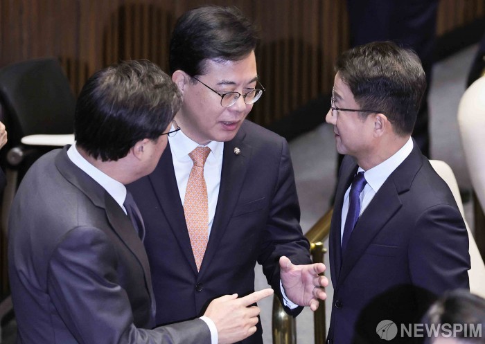 [서울=뉴스핌] 윤창빈 기자 = 한병도 더불어민주당 원내대표, 송언석 국민의힘 원내대표가 3일 서울 여의도 국회에서 열린 본회의에서 대화를 나누고 있다. 2026.02.03 pangbin@newspim.com