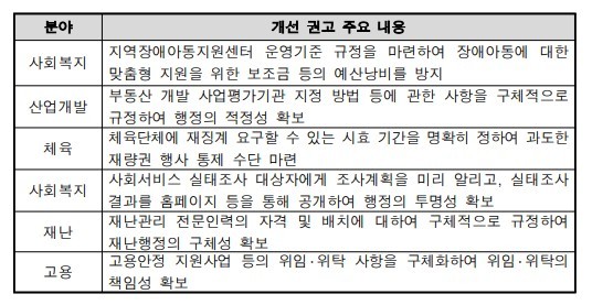 분야별로는 환경·보건 분야에서 34개 법령 대상 69건의 권고가 이뤄졌다. 비율로 보면 27.9%로 가장 많았다. 이어 산업·개발 분야 21.3%(26개 법령 대상 47건 권고), 국방·보훈 16.4%(20개 법령 대상 47건 권고) 순이었다.