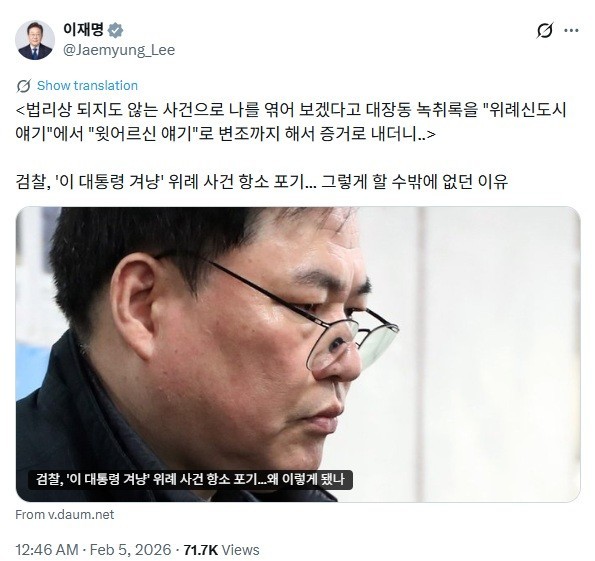 이 대통령은 이날 새벽 1시께 자신의 엑스(X·옛 트위터)를 통해 "검찰, '이 대통령 겨냥' 위례 사건 항소 포기… 그렇게 할 수밖에 없던 이유"라는 제목의 언론보도를 공유하며 이같이 올렸다.