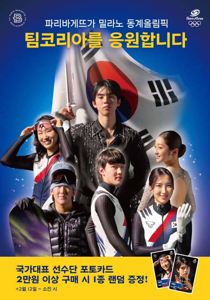 또 2월 12일부터는 전국 파리바게뜨 매장에서 2만 원 이상 구매 고객을 대상으로 '팀코리아' 포토카드를 선착순 증정한다. 2026 밀라노코르티나 동계올림픽에 출전한 선수단의 모습을 담은 포토카드 2종이 랜덤으로 제공되며, 만 19세 이상 성인이면 누구나 참여할 수 있다. 포토카드는 매장별 한정 수량으로 준비돼 소진 시 조기 종료될 수 있다.