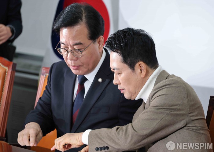 [서울=뉴스핌] 윤창빈 기자 = 장동혁 국민의힘 대표, 송언석 원내대표가 5일 서울 여의도 국회에서 열린 최고위원회의에서 대화를 하고 있다. 2026.02.05 pangbin@newspim.com
