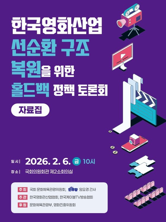 국회 문화체육관광위원회 더불어민주당 임오경 의원이 주최하고 한국영화관산업협회, 한국케이블TV방송협회가 주관하는 '한국영화 산업의 선순환 구조 복원을 위한 홀드백 정책 토론회'가 오는 6일 오전 10시 서울 여의도 국회의원회관 제2소회의실에서 열린다.