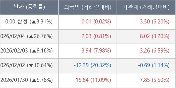 [서울=뉴스핌] 로보뉴스 = 05일 10시 15분 현재 제룡전기(033100)는 외국인과 기관이 각각 0.01 만 주, 3.50 만 주 순매수(잠정) 하면서 전일 대비 3.31% (현재가 62,400원) 상승하고 있다.