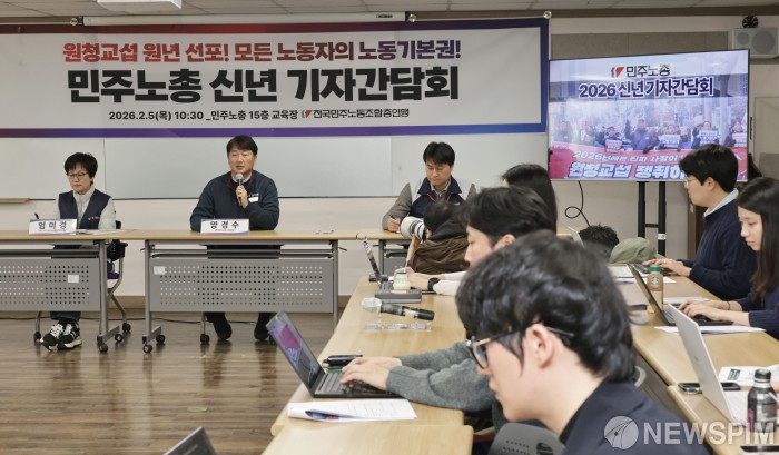 [서울=뉴스핌] 양윤모 기자 = 양경수 민주노총 위원장이 5일 오전 서울 중구 정동 민주노총 15층 교육장에서 개최된 '민주노총 2026 신년 기자간담회' 에 참석해 발언을 하고 있다. 엄미경 사무총장 직무대행,전호일 대변인,이겨레 부대변인 참석한 이날 행사에서 2026년을 원청 교섭, 초기업 교섭 쟁취 원년으로 모든 노동자의 노동기본권 쟁취하겠다는 민주노총의 과제 및 7월 총파업 투쟁 등 올해 계획을 밝혔다. 2026.02.05 yym58@newspim.com