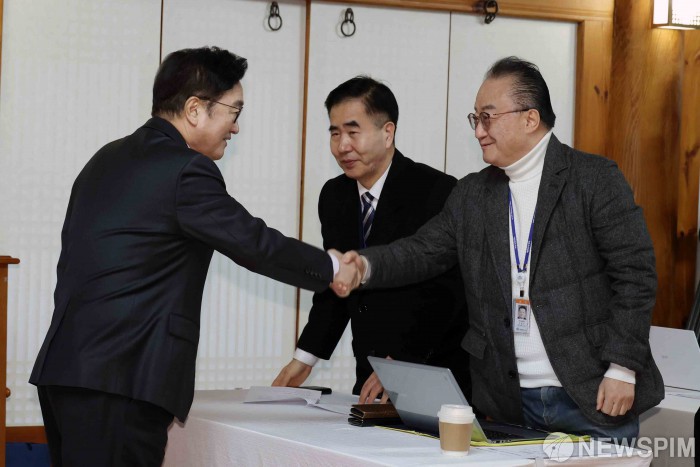 [서울=뉴스핌] 윤창빈 기자 = 우원식 국회의장이 5일 오전 국회 사랑재에서 열린 신년 기자회견에 참석해 취재진과 인사를 나누고 있다. 2026.02.05 pangbin@newspim.com