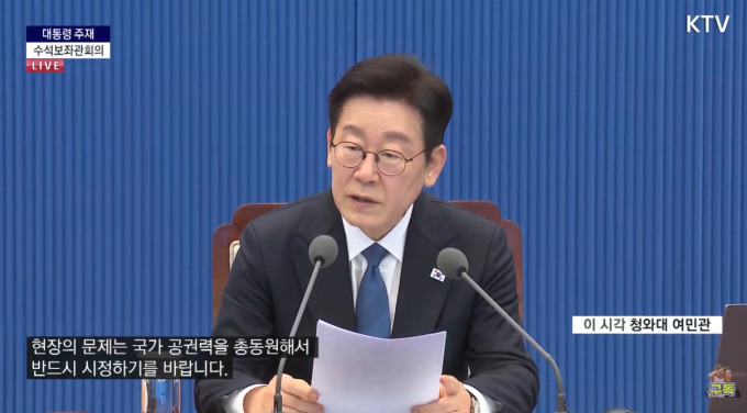 이 대통령은 또 공정거래위원회의 담합 조사 후속 조치와 관련해 "(기업이) 담합해 가격을 올렸으면 (도로) 가격을 내려야 하는데 내렸는지 모르겠다. (담합 기업이) 사과하고 할인행사하고 모르는 척 넘어가는 일이 없게 끝까지 철저히 관리하라"며 "가격조정명령제도라는 게 있던데 적극 활용해야 한다. 정책 신뢰를 높이려면 적당히 하다 넘어간다는 생각을 못 하게 해야 한다"고 했다.