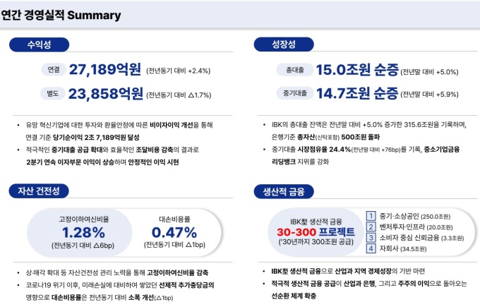 중소기업대출 잔액은 전년말 대비 14조7000억원(5.9%) 증가한 261조9000억원으로 집계됐다. 시장점유율은 24.4%를 기록하며 은행기준 총자산 500조원을 돌파했다.