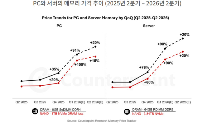 카운터포인트리서치 메모리 가격 트래커에 따르면 PC용 범용 D램인 8GB DDR4 가격은 지난해 4분기 35% 상승한 데 이어 올해 1분기에는 91% 오를 것으로 예상된다. 2분기에는 상승률이 20% 수준으로 둔화될 전망이다.
