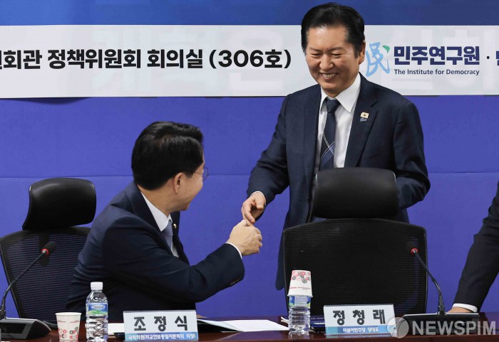 [서울=뉴스핌] 윤창빈 기자 = 정청래 더불어민주당 대표, 조정식 더불어민주당 외교안보통일자문회의 의장이 5일 서울 여의도 국회 의원회관에서 열린 대한민국 대전환 5차 토론회에서 인사를 나누고 있다. 2026.02.05 pangbin@newspim.com