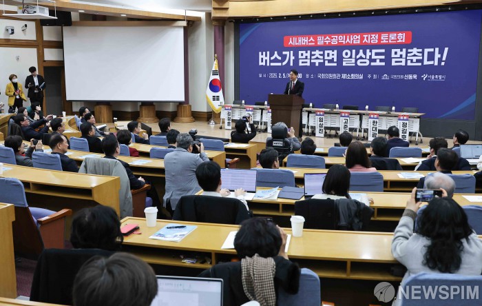 [서울=뉴스핌] 윤창빈 기자 = 토론회를 공동 주최한 오세훈 서울시장이 5일 서울 여의도 국회 의원회관에서 열린 시내버스 필수공익사업 지정 토론회에서 인사말을 하고 있다. 2026.02.05 pangbin@newspim.com
